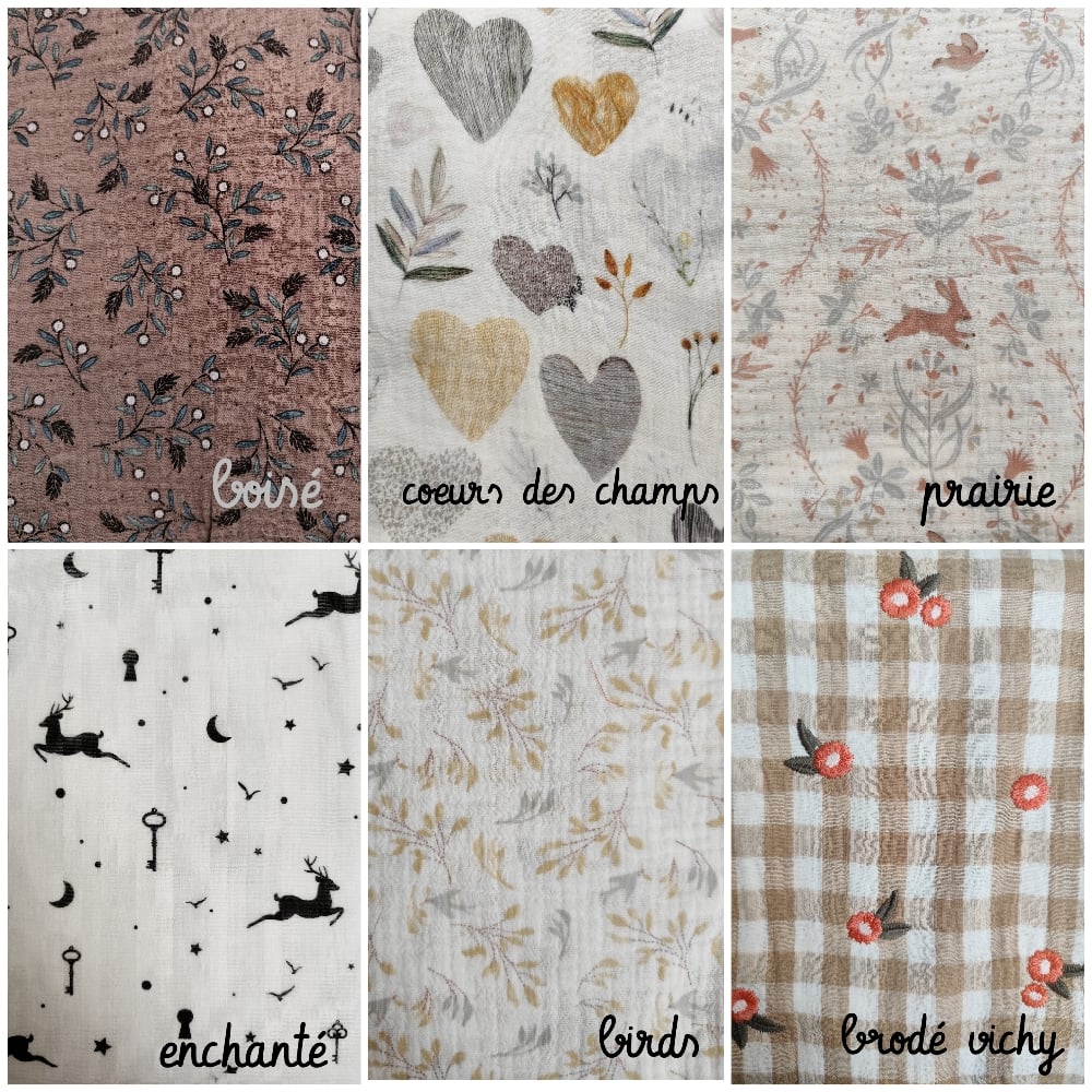* Le nom (exemple : Prairie...) du tissu à motifs que
