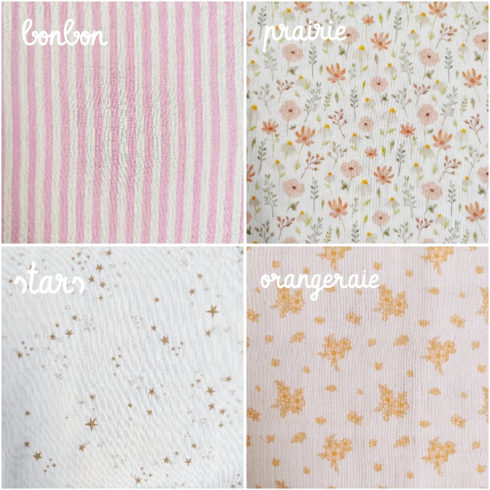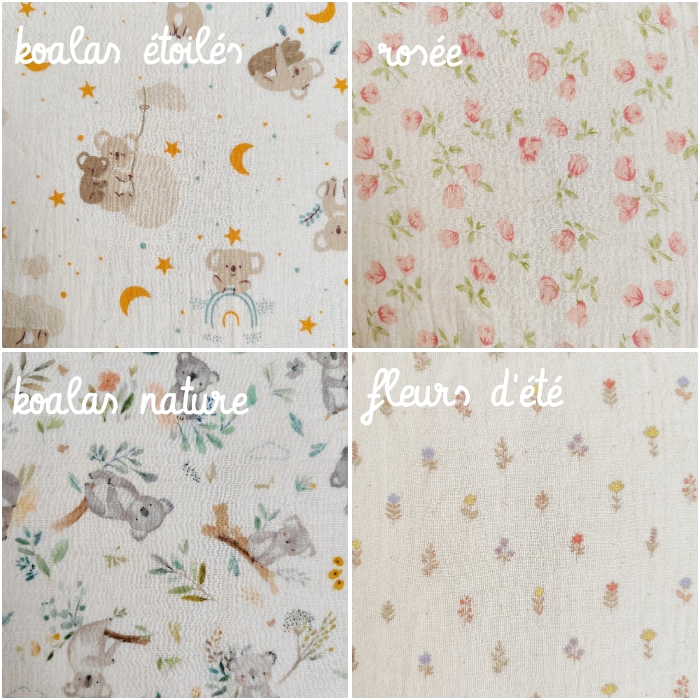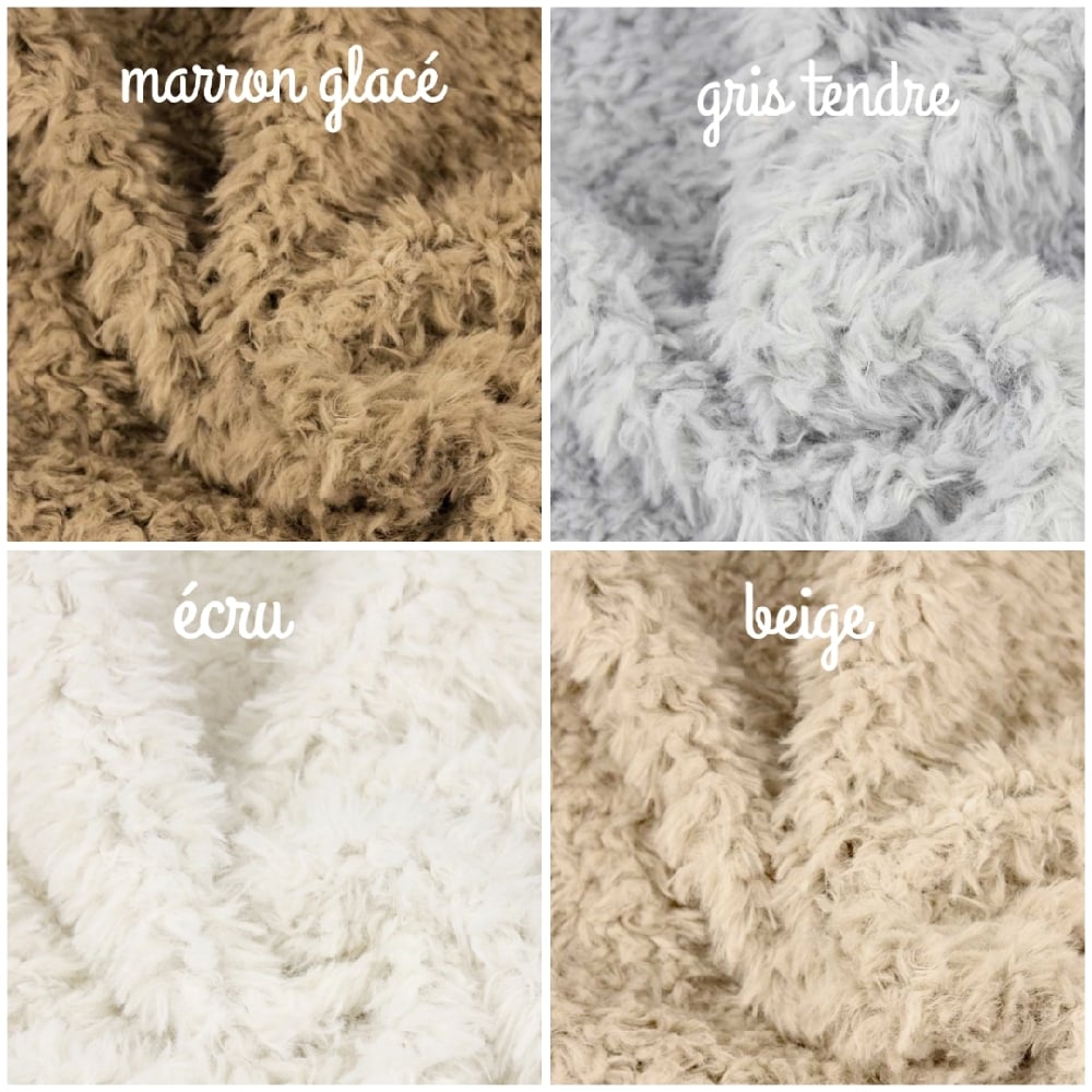 Ici dans sa version avec devant en double gaze de coton à motifs (voir les différents motifs sur les images) et dos en fourrure toute douce polyester écru, beige, gris tendre ou marron glacé.