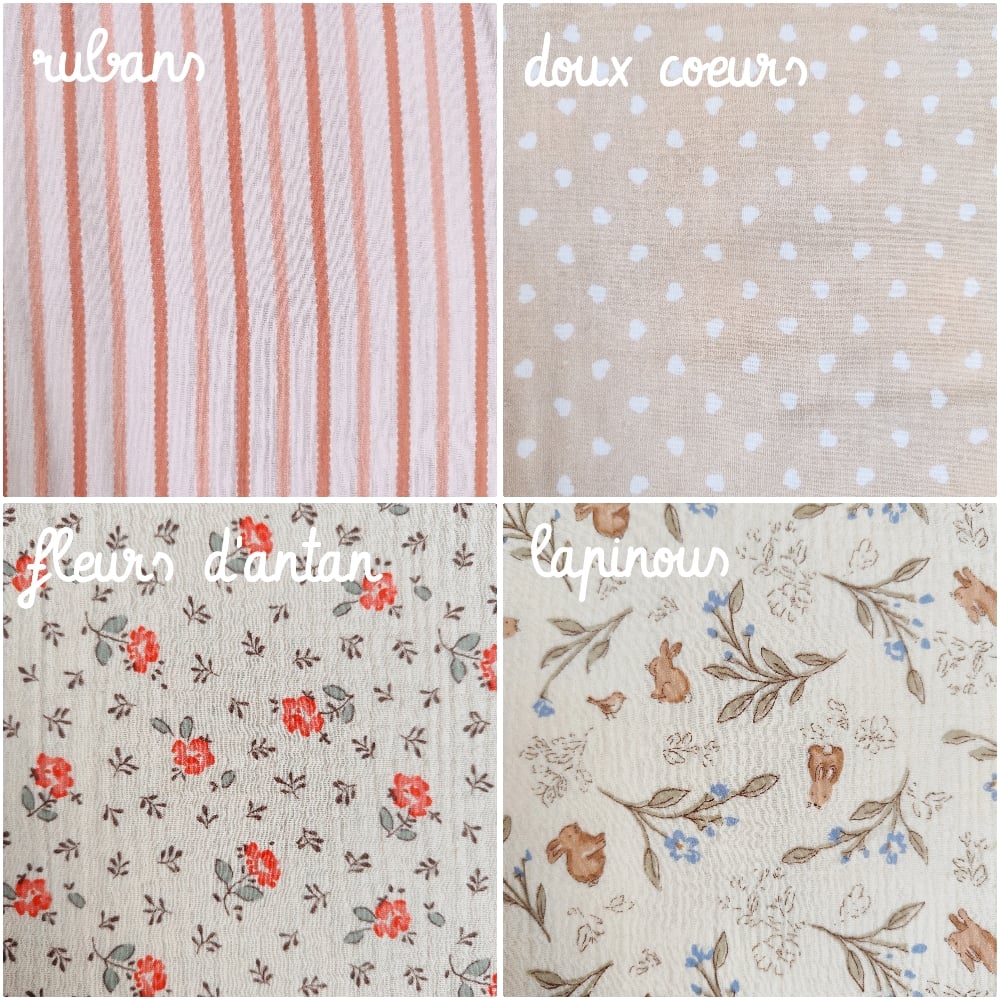 * Le nom (exemple : Doux cœurs...) du tissu à motifs que vous souhaitez pour le recto et les oreilles du doudou. Les oreilles peuvent être d'un motif différent du corps, il suffit de me l'indiquer.